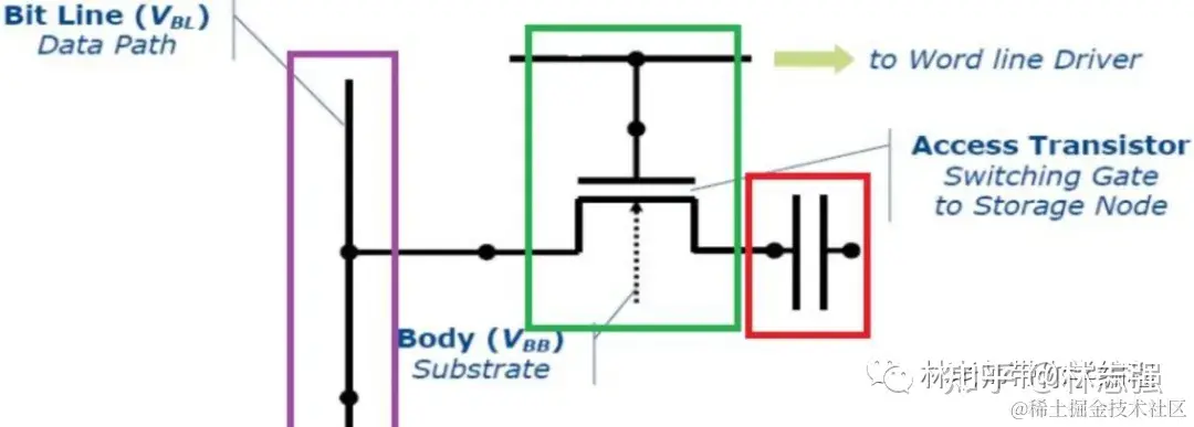 图中紫色部分叫做Bit Line,它是上面提到的数据信号控制器,需要写入的数据信号,就是通过这个控件来写入电容的。绿色部分是用来控制电容的写入和读出的,红色部分就是电容。Bit Line负责数据的传递,绿色的Word Line和电晶体负责开关,红色电容负责存储信号,这里就是DRAM存储器的基础了。
