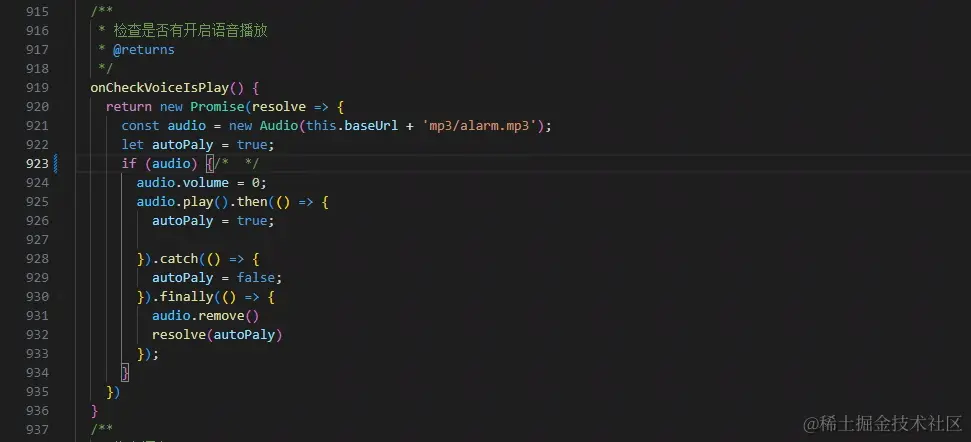 根据这个函数我们获取到在用户刷新页面后音频播放就会失效,从而对应失效后就设置对于的红色感叹号效果,这只是我这里业务引导用户的操作,我们也可以用弹出框,或者各种tips小提示框也行,只要用户鼠标点击或者移动就可以重新初始化语音播放的API,非常方便。