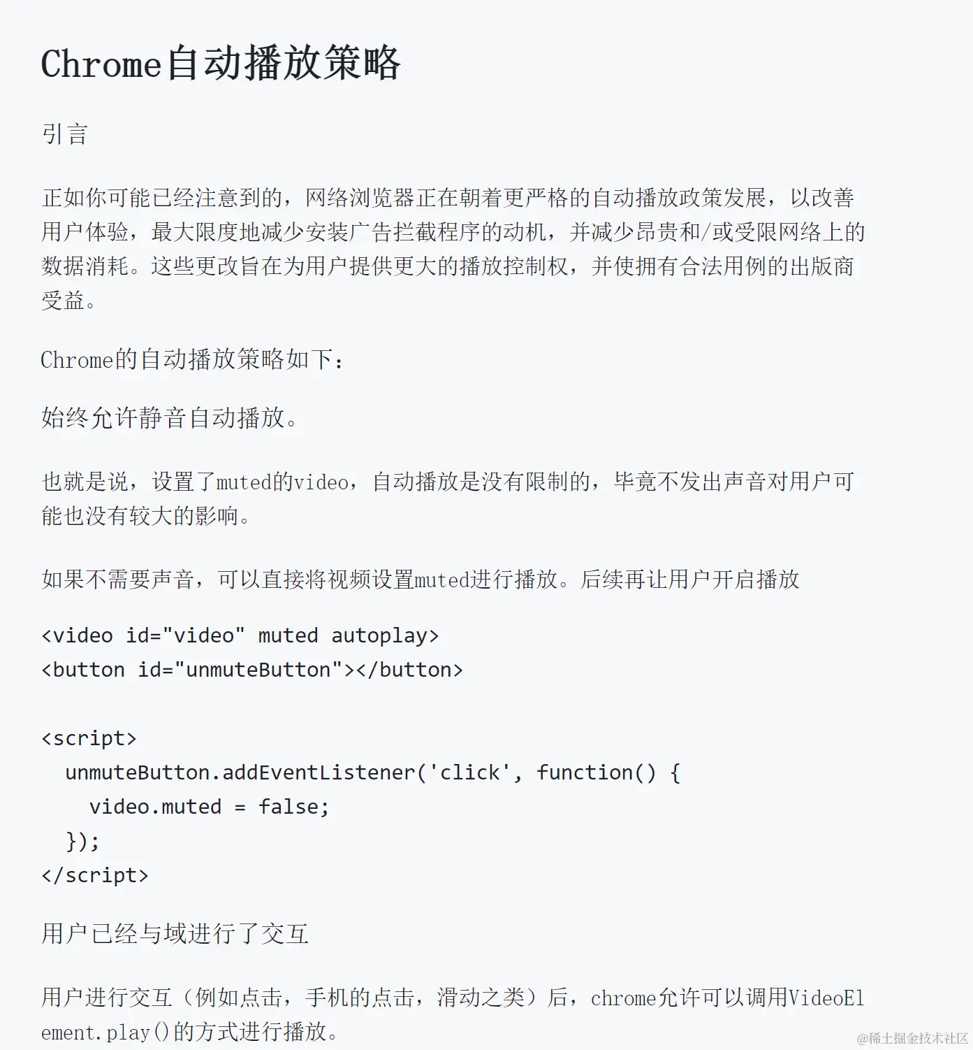 大概的意思就告诉大家,为了用户的体验不支持自动播放,但支持静音播放和交互播放。重要的是交互播放,只要我们在页面上点击了就可以进行音频播放,那个交互我们要怎么实现才好了......