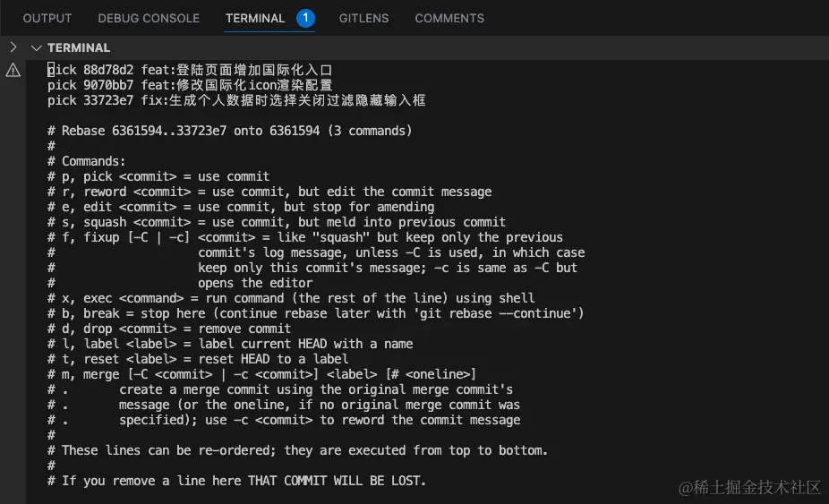 在开发过程中,commit 了好几次,但是突然发现有文件漏了提交,而且还是前几次的,希望能够将遗漏的文件直接插入已经提交过的历史版本中,或者想修改更早的提交信息,可以通过交互式 rebase 来更改。