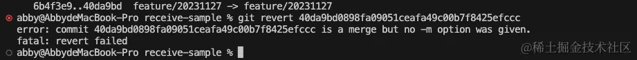 当想要撤销一个合并提交时,-m 选项是必需的,其后面的数字用来指定想要撤销哪个父提交的更改。这是因为在一个合并提交中,通常有两个父提交,合并进来的分支是第一个父提交 Parent 1,被合并的分支是第二个父提交 Parent 2,因此通常使用的是 -m 1。如果不指定 -m 选项,Git 就不知道当前想要撤销哪个父提交的更改,所以会给出一个错误信息,如下图所示: