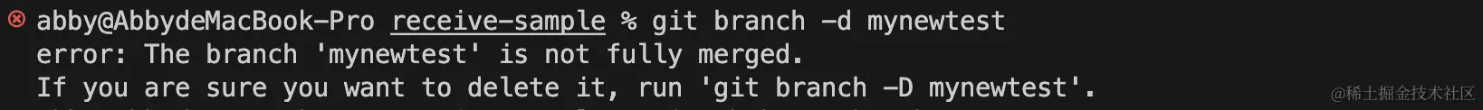 总的来说,想要删除本地分支,可以选择使用 -d 进行安全删除,或者 -D 进行强制删除。下图是使用 -d 选项删除 mynewtest 分支时的报错信息: