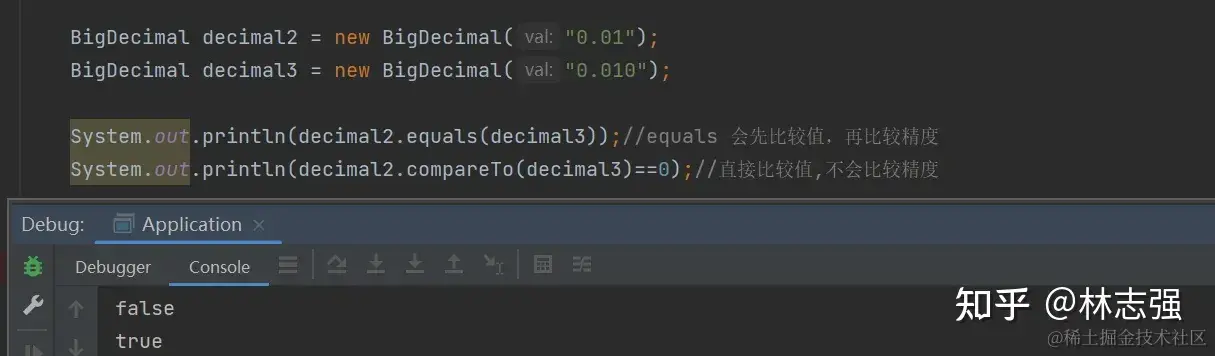 BigDecimal decimal2 = new BigDecimal("0.01"); BigDecimal decimal3 = new BigDecimal("0.010"); //false,因为精度不一样 decimal2.equals(decimal3); //true, 只比较数值,不会比较精度 decimal2.compareTo(decimal3)==0;