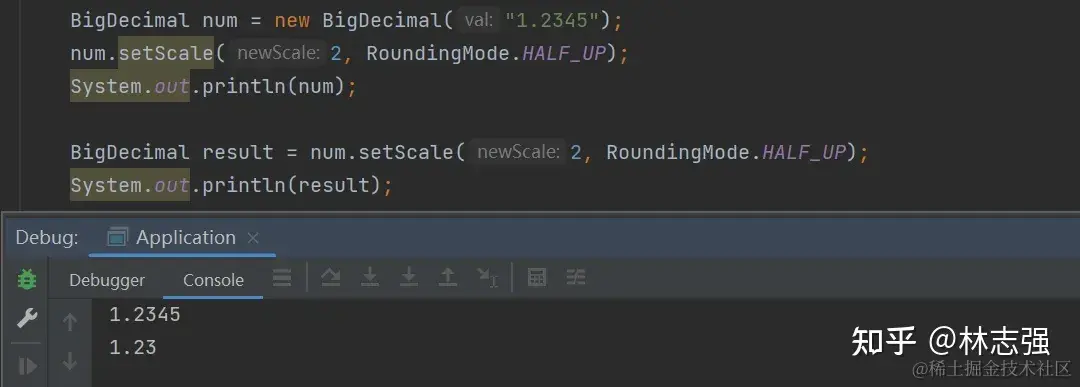 BigDecimal num = new BigDecimal("1.2345"); // num变量并没有变化,还是4位小数; num.setScale(2, RoundingMode.HALF_UP); // result 才是四舍五入后并保持2位小数点。 BigDecimal result = num.setScale(2, RoundingMode.HALF_UP);