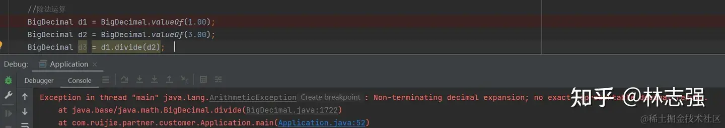 上述代码执行后,会直接抛出异常:java.lang.ArithmeticException: Non-terminating decimal expansion; no exact representable decimal result.