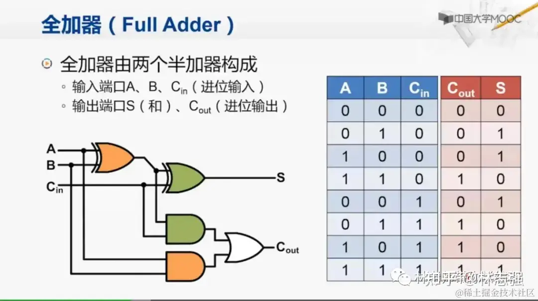 通过3个输入+2输入的形式,就可以实现01+10(二进制),最后通过多个加法器的组合,我们就可以实现任意位的加法器了。