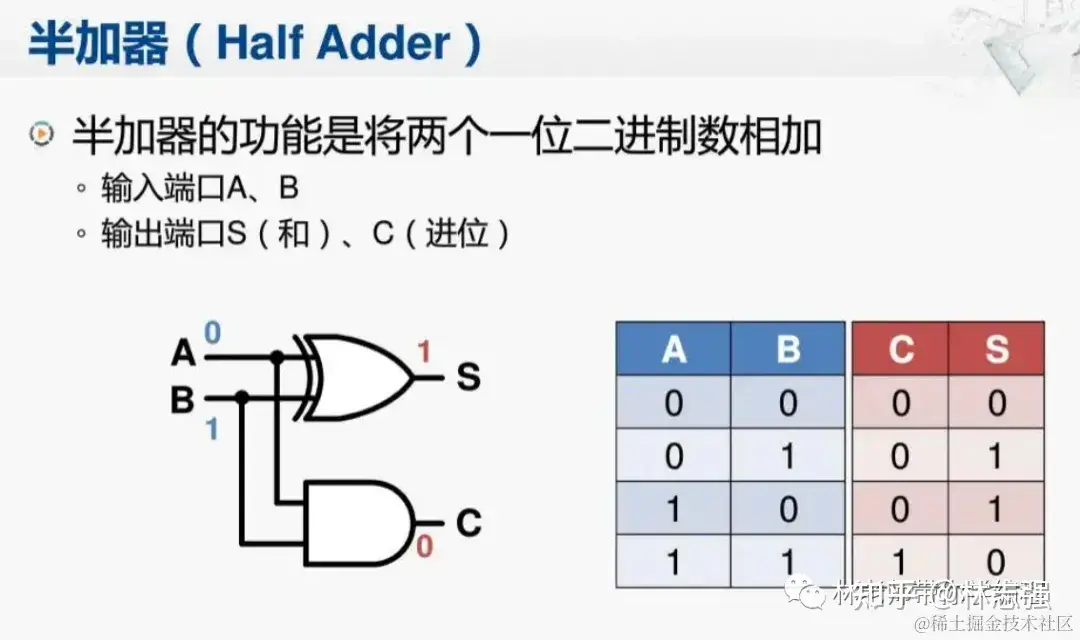 通【异或门】+【与门】我们就可以实现一个最简单的半加法器,如上图所示,如果A和B都是1的情况下,S为0,C为1,就变成10,这就可以实现一个最简单的半加法器了。