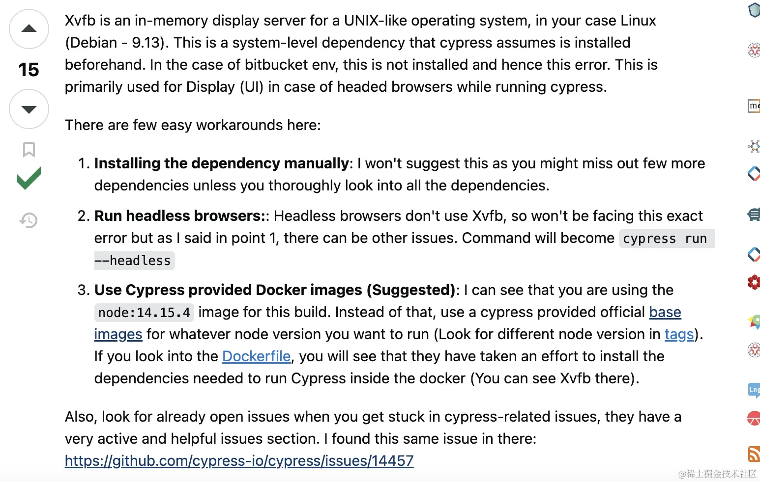 cypress run --headless,headless browsers不使用Xvfb, 但是这个方案也可能会出现其它问题。 - 最推荐的是第三个了,安装