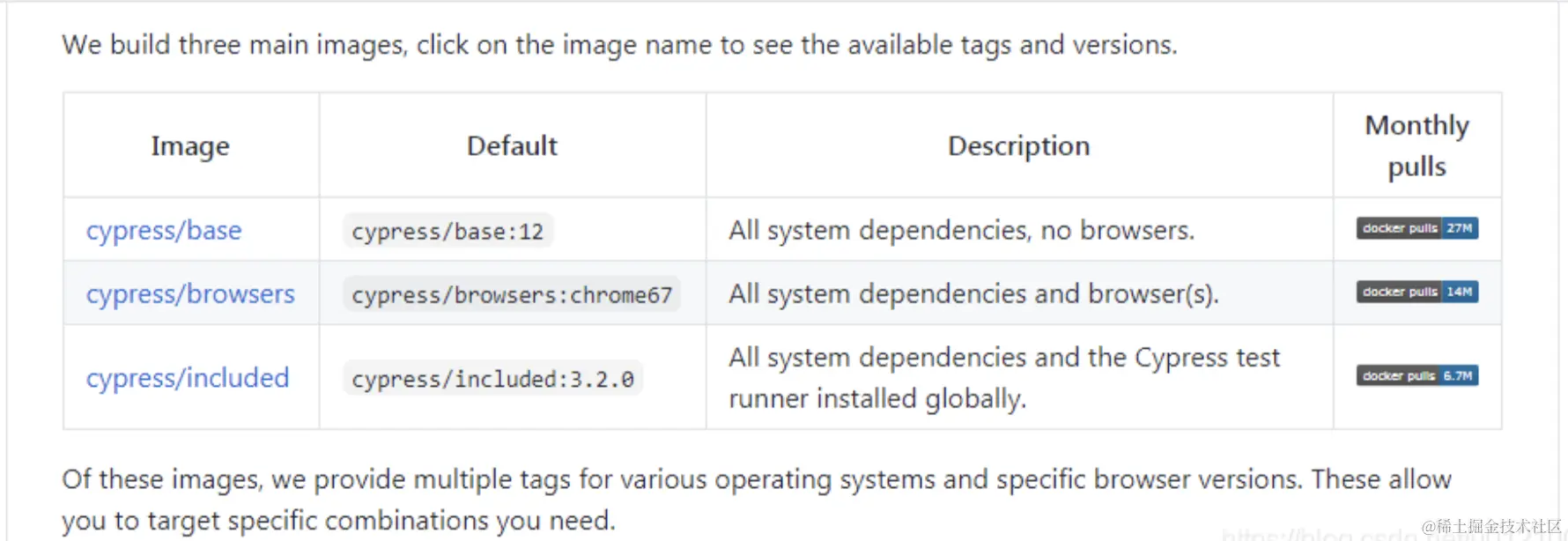 cypress/included:10.8.0后面的Cypress版本和本地Cypress版本不需要一模一样,只要不是太大版本差异就可以。同理cypress/browsers:node-16.18.1-chrome-110.0.5481.96中node版本也不必一模一样; - 官方镜像比如