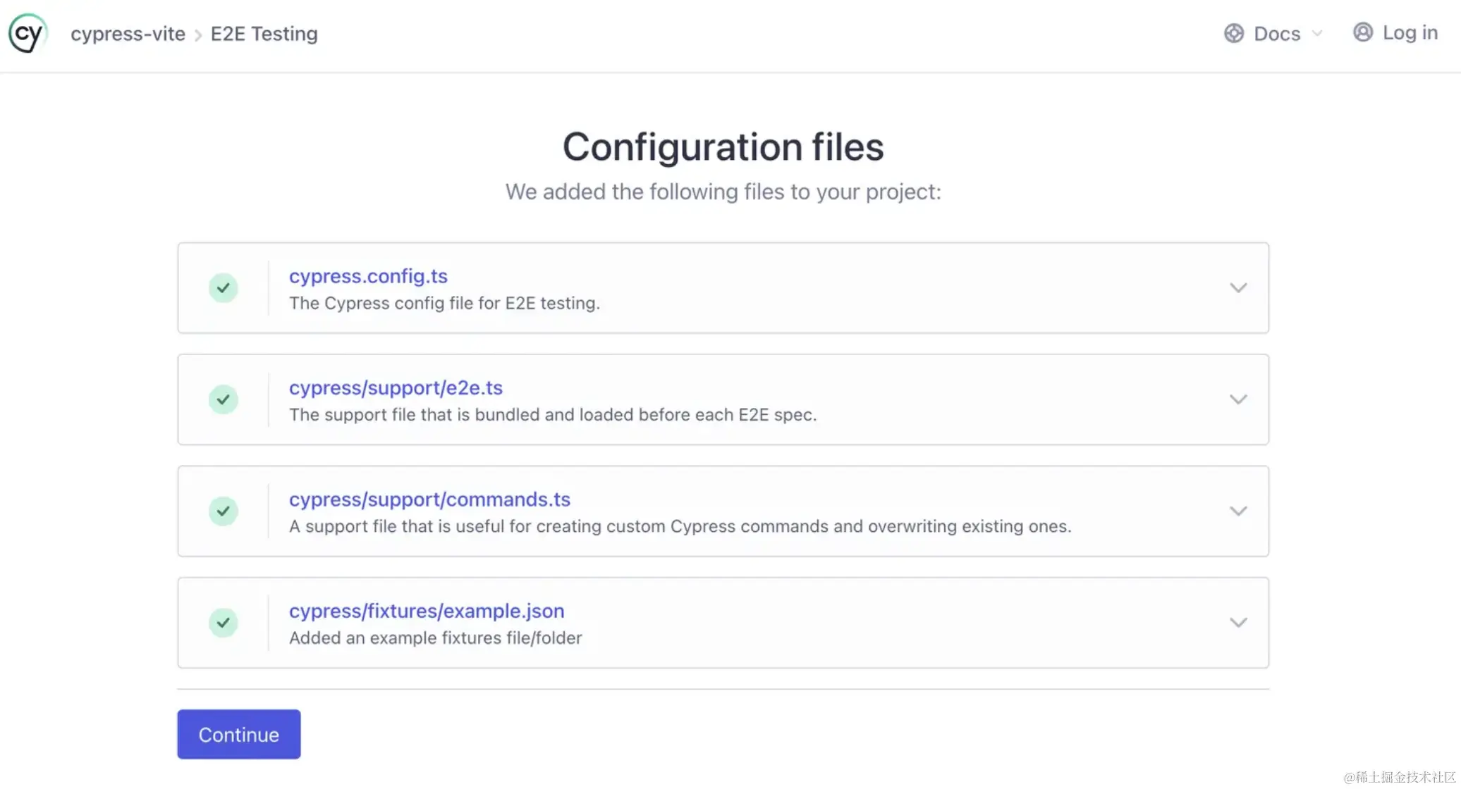 点击continue,会在我们项目中生成Cypress目录,并将这些文件加入到Cypress中。