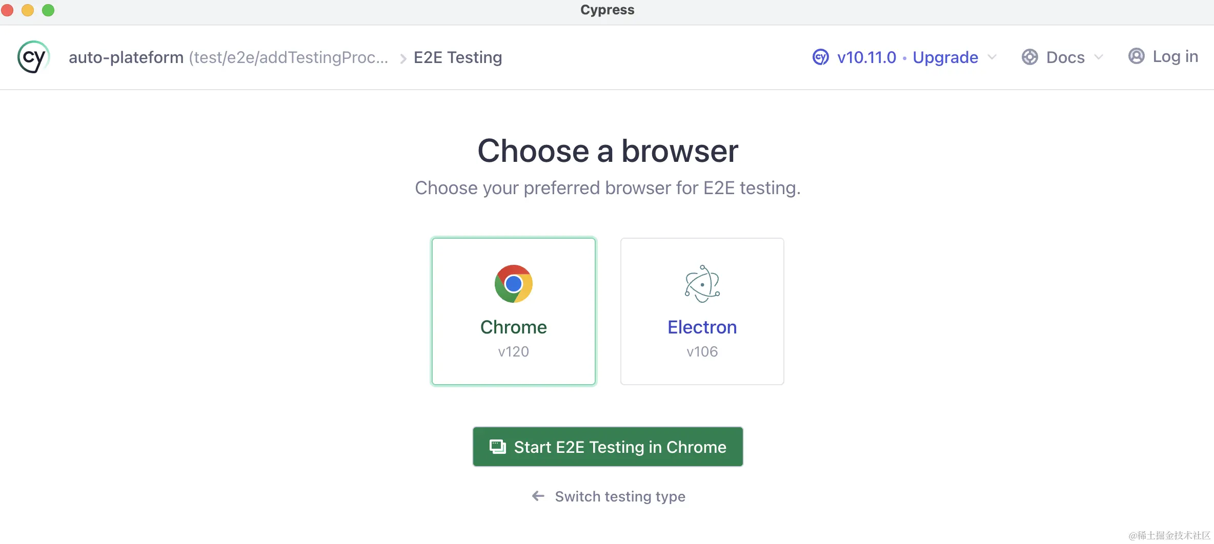 我们执行yarn cypress open, 提示选择浏览器,选择第一个Chrome。