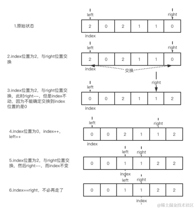 这里的重点和难点index位置为2进行交换后为什么只进行right--,而不用index++呢?这是因为我们right位置交换过来的元素可能是0,也可能是1。如果是0自然没问题,但是如果是1则执行index++就将1跳过了无法处理了。所以我们先不动index,在下一次循环时继续判断这个index位置元素是不是0。