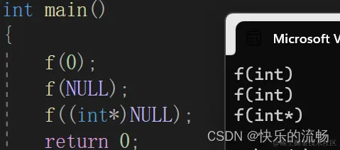 - 程序本意是想通过f(NULL)调用指针版本的f(int*)函数,但是由于NULL被定义成0,因此与程序的初衷相悖。