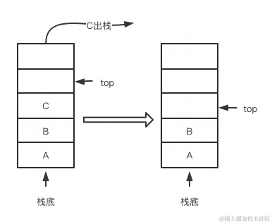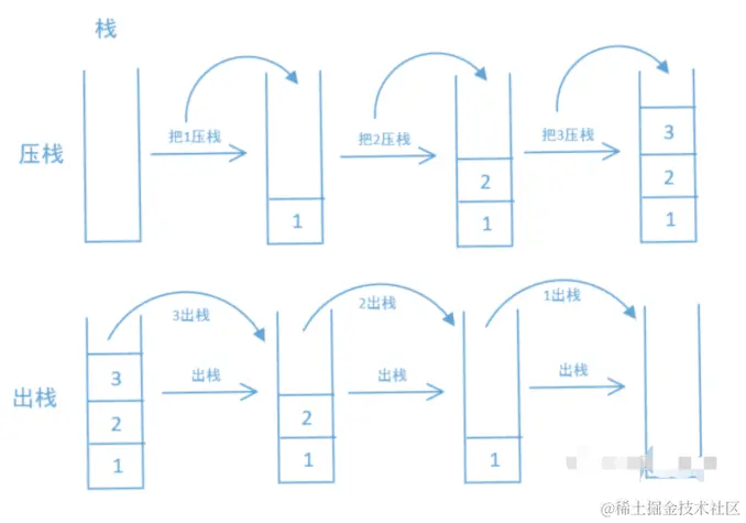 栈底层实现仍然是链表或者顺序表,栈与线性表的最大区别是数据的存取的操作被限制了,其插入和删除操作只允许在线性表的一端进行。一般而言,把允许操作的一端称为栈顶(Top),不可操作的一端称为栈底(Bottom),同时把插入元素的操作称为入栈(Push),删除元素的操作称为出栈(Pop)。若栈中没有任何元素,则称为空栈,栈的结构如下图: