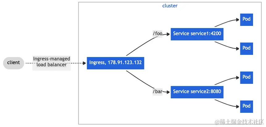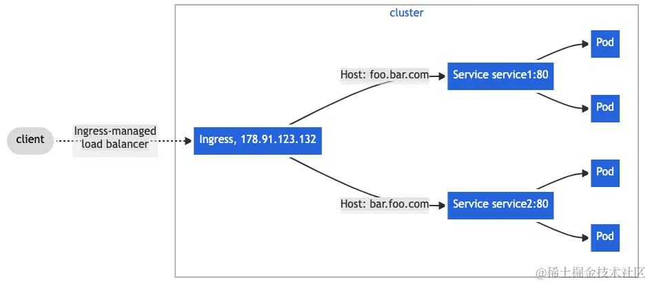 ingress根据用户自定义的路由规则进一步转发到service。- 比如根据请求的 path 路径或 host 做转发。