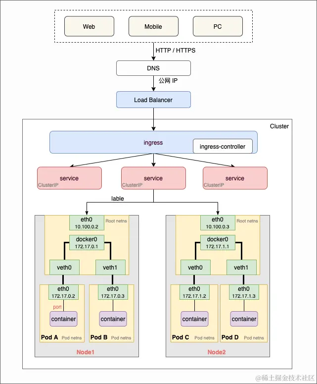 IP地址通常会绑定一个Load Balancer负载均衡器,此时请求会进入此负载均衡器。Load Balancer负载均衡器可以是硬件,也可以是软件,它通常会保持稳定(固定的公网 IP 地址),因为如果切换 IP 地址会因为 DNS 缓存的原因导致服务某段时间内不可达。Load Balancer负载均衡器是一个重要的中间层,对外承接公网流量,对内进行流量的管理和转发。