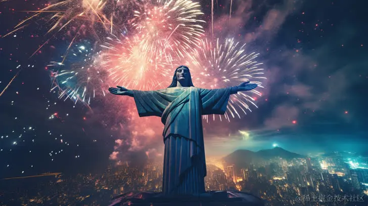里约石像狂欢夜晚烟花,以Beeple风格、名人摄影、银色与青铜、Dimitry Roulland、未来主义影响、古典、历史场景、引人入胜的视觉叙事呈现