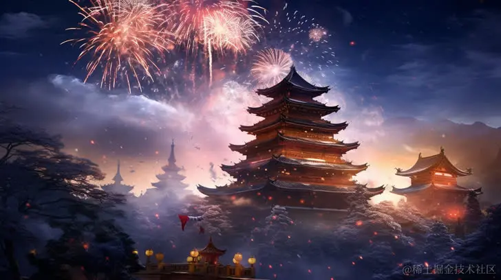 古老的宝塔上空烟花绽放,以写实风景、32K超高清、幻想插画、雪景、文化多元元素、龙核心、国际风格呈现
