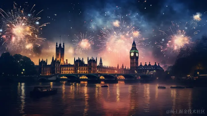 伦敦圣诞守夜,烟花与大本钟,以写实风景风格呈现,不祥的氛围,伦敦画派,哑光照片,浪漫的河景,如梦般的城市风景,高质量照片