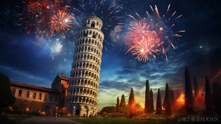 比萨斜塔烟花秀,以写实风景风格呈现,超高清图像,大画幅镜头,文艺复兴透视,原色调,风格新颖,后期处理