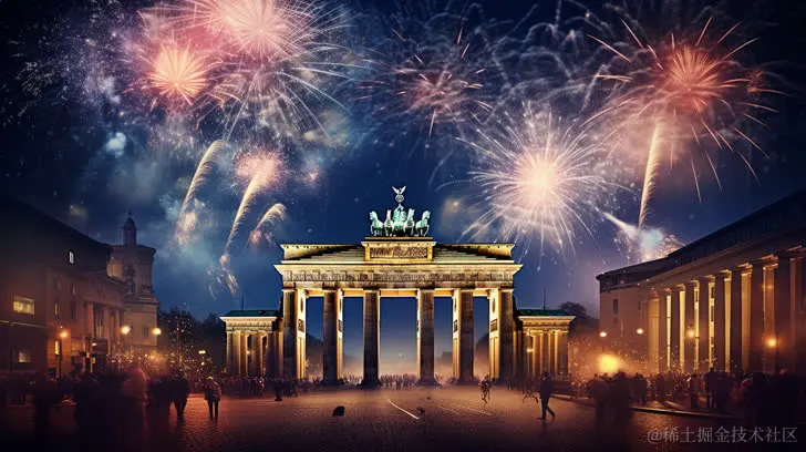 勃兰登堡门柏林德国城市风景与烟花,以拉斐尔·皮尔风格、写实技巧、Flickr、Caras Ionut、装饰艺术灵感、银色与海军蓝色、创意共用属性呈现
