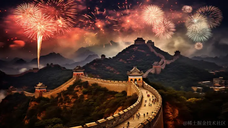 长城烟花,以写实超现实主义、传统风景、哑光照片风格呈现,令人陶醉的城市风景,精心细致,后期处理