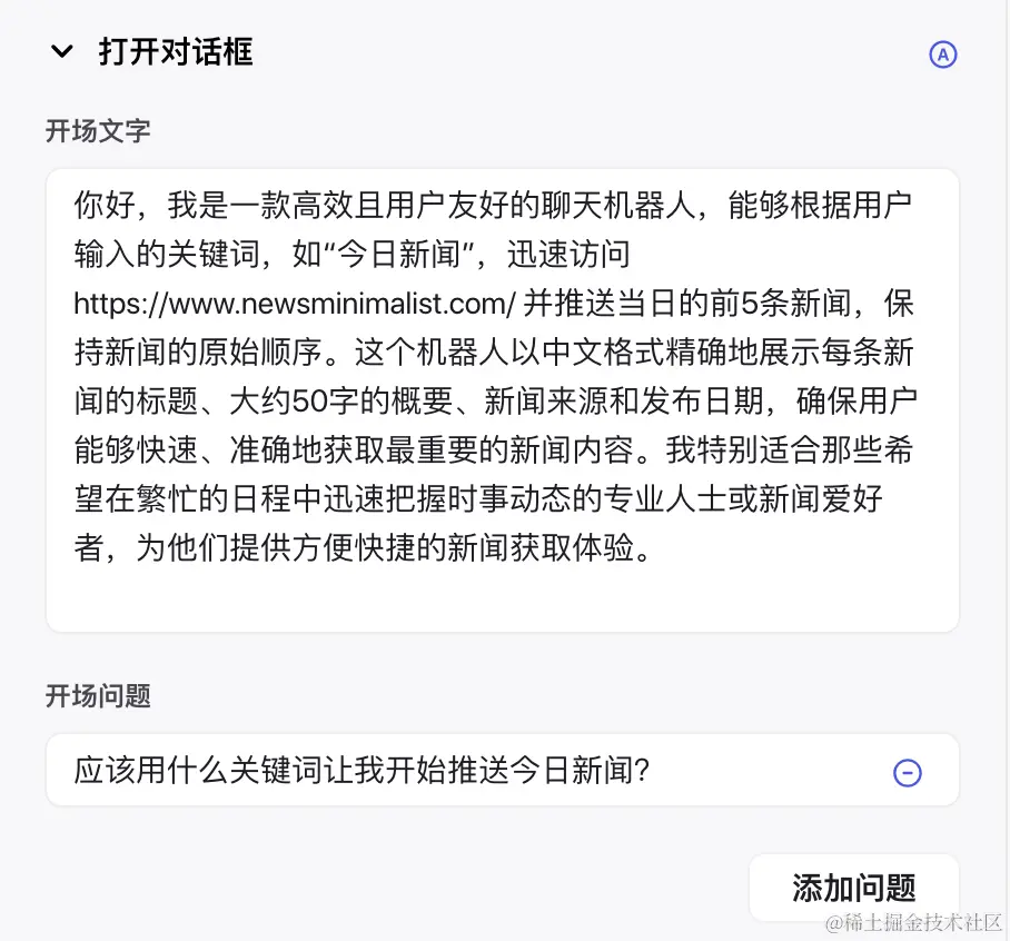 我希望能定制化地搭建一个聊天机器人,让它从News Minimalist网站自动提取前5条新闻(由于News Minimalist首页默认展示significance score大于等于6的新闻,所以可以保证新闻的质量)。推送新闻的时间可以自定义,我这里定位每日下午4点自动推送。同时,我还希望能设置一个关键词,当我输入这个关键词时,机器人也将自动提取News Minimalist的新闻并按照特定的格式推送给我。