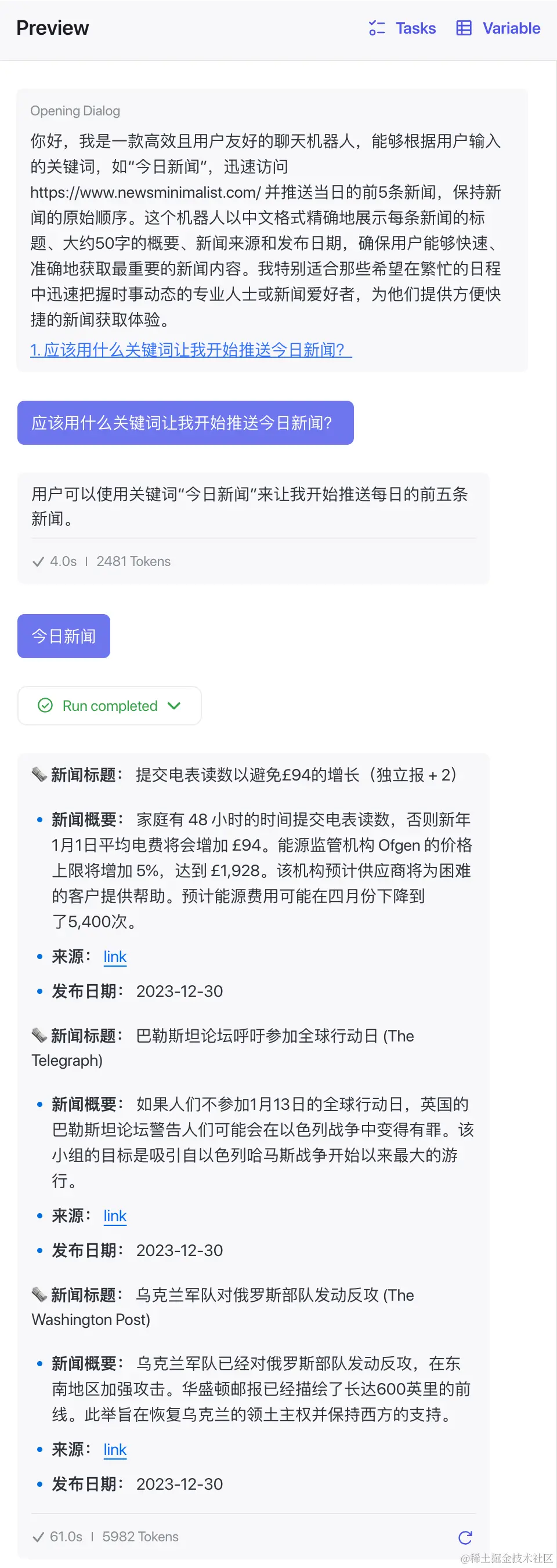首先在发布机器人前可以在右侧的预览框里进行测试和调试,其实到这里如果不想发布,就已经可以使用这个新闻播报机器人了。