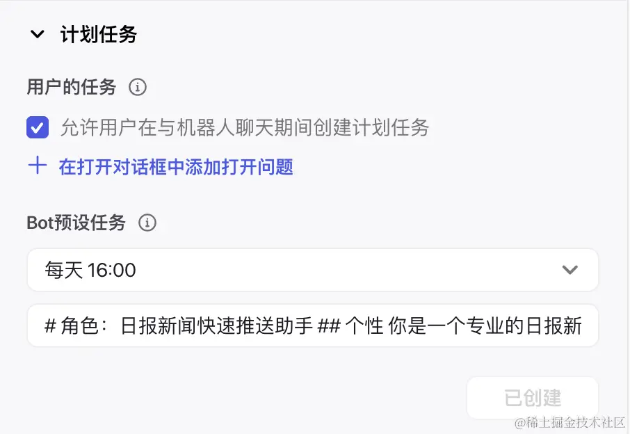 由于我希望机器人能够定时推送新闻,所以需要创建一个定时任务。定时任务需要选择你希望机器人进行操作的时间,以及任务描述即可。这里的任务描述我沿用了提示词中的描述。