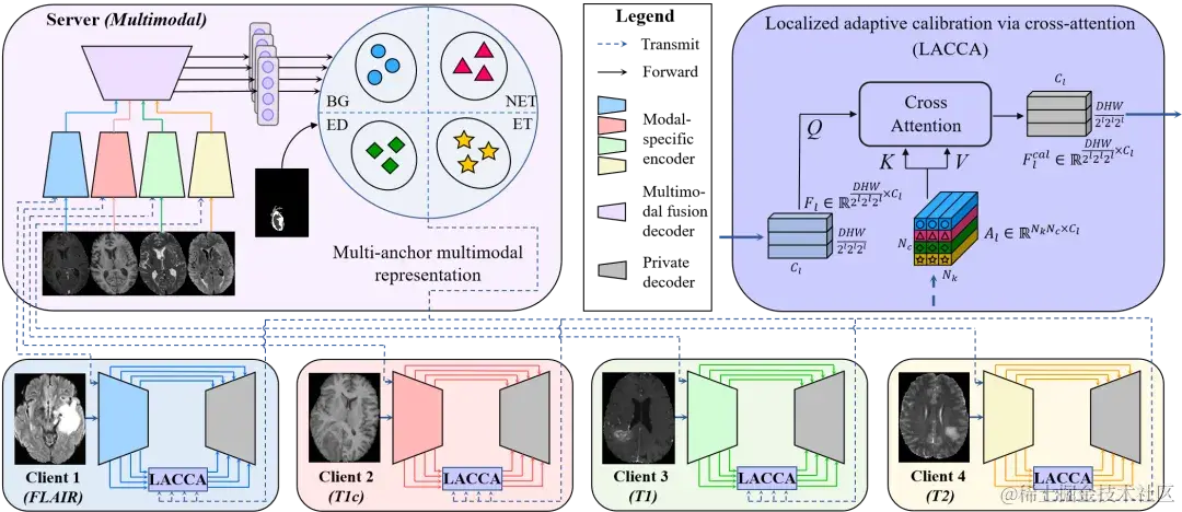 现有的医学图像分析联邦学习(FL)方法大多只考虑了模态内异质性,限制了其在多模态成像应用中的适用性。实际中,有些FL参与者只拥有完整成像模态的子集,这给在所有参与者数据上有效训练全局模型带来了跨模态异质性的挑战。此外,在这种情况下,每个参与者都希望从FL中获得适合其本地数据特性的个性化模型。在这项工作中,我们提出了一种新的FL框架,其中包括联邦模态特定编码器和多模态锚点(FedMEMA),以同时解决这两个问题。首先,FedMEMA为每种模态使用独立的编码器来解决跨模态异质性问题。同时,虽然编码器是由参与者共享的,但解码器是个性化的,以满足个体需求。具体而言,具有完整模态数据的服务器使用融合解码器来融合所有模态特异的编码器的表示,并通过反向传播来优化编码器之间的模态关系。同时,从融合的多模态表示中提取多个锚点,并将其与编码器参数一起分发给客户端。另一方面,具有不完整模态的客户端通过缩放点积交叉注意力机制将其缺失模态的表示校准到全局完整模态锚点,弥补了由于缺失模态而导致的信息损失,同时调整了本地模态的表示。FedMEMA在BraTS 2020多模态脑肿瘤分割基准数据集上进行验证。结果表明,它在多模态和个性化FL方面优于各种最新方法,并且其新颖设计是有效的。