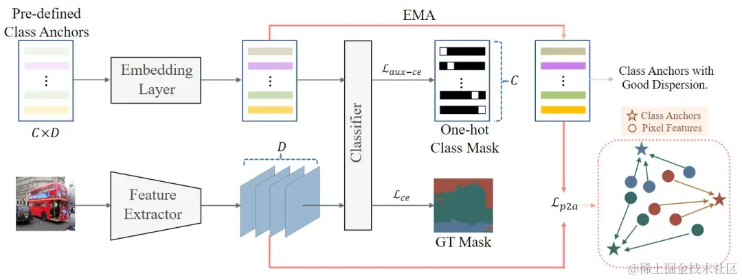 表示学习的最终目标之一是在类内实现紧凑性,并在类间实现良好的可分性。针对这一目标,已经提出了许多基于度量和原型的杰出方法遵循期望最大化范式。然而,它们不可避免地会引入偏差到学习过程中,特别是在长尾分布的训练数据中。在本文中,我们揭示了类原型不一定需要从训练特征中派生,并提出了一种新的视角,使用预定义的类锚点作为特征中心来单向引导特征学习。然而,预定义的锚点可能与像素特征存在较大的语义距离,这使得它们无法直接应用。为了解决这个问题并生成与特征学习无关的特征中心,我们提出了一种简单而有效的语义锚点正则化(SAR)。SAR通过在训练过程中使用分类器感知的辅助交叉熵损失来确保语义空间中语义锚点的类间可分性,并与特征学习解耦。通过将学习到的特征拉向这些语义锚点,可以获得几个优势:1)类内紧凑性和自然的类间可分性,2)可以避免特征学习引入的偏差或错误,3)对长尾问题具有鲁棒性。所提出的SAR可以以即插即用的方式应用于现有模型中。大量实验证明,SAR在语义分割等视觉任务中的性能甚至优于复杂的原型方法。
