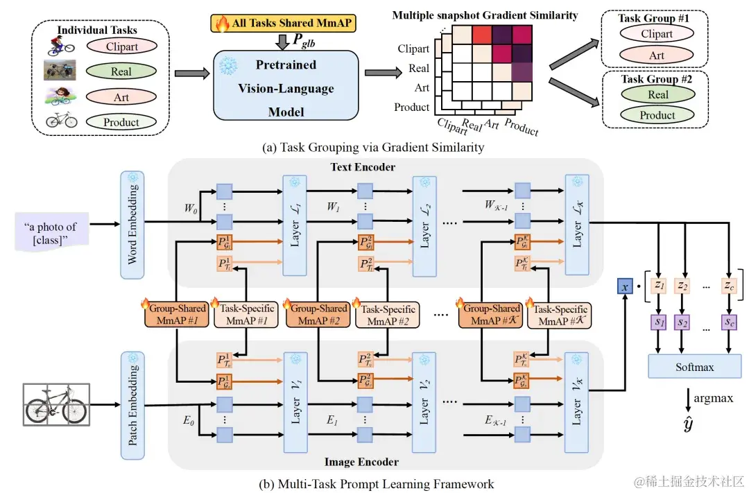多任务学习(MTL)旨在同时训练多个相关任务,并提高各个子任务的效果。面向多任务学习的网络结构通常会为每一个任务设置独立的解码器(decoder)结构,因此,解码网络的计算复杂度会随着任务数量的增加而线性增加。为了解决这个问题,本文将图文预训练模型CLIP引入跨域多任务学习中,利用提示学习实现了一种“decoder-free”的多任务学习框架。本文认为,尽管针对CLIP的提示学习已经在多个视觉任务中表现出优越的性能,但是现有方法仅对CLIP的单一模态(文本或视觉)进行微调,破坏了CLIP的模态对齐。因此,本文首先提出了一种针对CLIP的多模态对齐提示(MmAP),以实现对文本和视觉模态的同时调整,保持CLIP的模态对齐特性。在MmAP基础上,本文设计了一种新颖的多任务提示学习框架。一方面,我们利用梯度驱动的任务分组方法,实现高相似性任务之间互补性的最大化;另一方面,我们为每个任务分配特定的MmAP,以保留任务的特有信息。在两个大型多任务学习数据集上,相比于全量参数微调,本文提出的方法在仅利用约0.09%的可训练参数的情况下,实现了显著的性能提升。