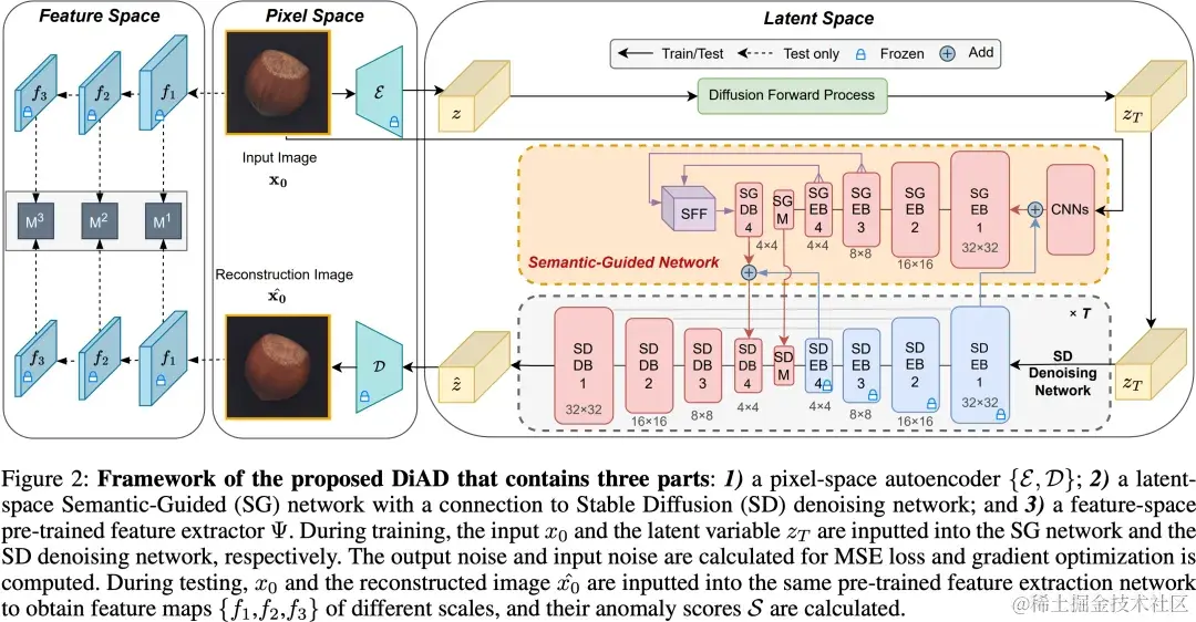 基于重构的方法在异常检测中取得了显著的成果。近期流行的扩散模型的卓越图像重构能力激发了研究人员利用它们来增强异常图像的重构的研究努力。然而,这些方法可能面临与保持图像类别和像素级结构完整性在更实际的多类设置中的挑战。为了解决上述问题,我们提出了一个基于扩散的异常检测(DiAD)框架,用于多类别异常检测,该框架包括一个像素空间的自编码器,一个与稳定扩散的去噪网络相连的潜在空间的语义引导(SG)网络,以及一个特征空间的预训练特征提取器。首先,SG网络被提出用于重构异常区域,同时保留原始图像的语义信息。其次,我们引入了空间感知特征融合(SFF)块,以在处理大量重构区域时最大化重构精度。第三,输入和重构的图像由预训练的特征提取器处理,以根据在不同尺度上提取的特征生成异常图。在MVTec-AD和VisA数据集上的实验证明了我们的方法的有效性,它超越了最先进的方法,例如,在多类别MVTec-AD数据集上分别达到了96.8/52.6和97.2/99.0(AUROC/AP)的定位和检测效果。