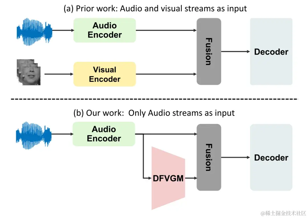 由于噪声对传统音频语音识别的影响,我们提出了一种结合音频和视觉信号的方法。然而,实际应用中并不总是能获取到配对的视频,这产生了视觉缺失模态的问题。为解决这一问题,我们提出了一种基于离散特征的视觉生成模型,该模型在训练中利用音频和视觉的语义对应关系,并在推理中生成视觉幻觉以代替真实视频。我们的方法在两个公开数据集上的实验表明,相比当前最先进的音频单独基线,我们的方法在词错误率上实现了显著的53%的相对降低,同时在不使用视频输入的音频-视觉设置下保持了相当的结果。