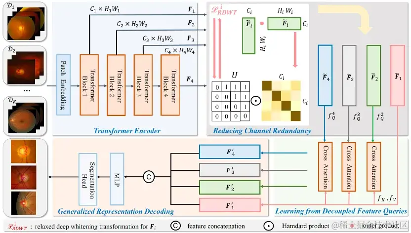 域泛化医学图像分割场景指模型在多个源域上训练,并在未见过的目标域上测试其泛化能力。由于收集自不同医院的图像可能使用不同的成像设备和扫描参数,不同中心的数据分布会有显著区别。理想的高泛化性特征在同一通道内对跨域图像具有相似的模式响应。然而,在应对显著的分布差异时,网络倾向于通过多个通道来捕获各源域图像上的同一模式,并允许同一通道中在跨域图像上表现出不同的激活模式。对此,我们提出以最小化跨域医学图像之间的通道相关性来消除特征冗余并最大化每个通道的表达能力。首先,我们提出了一种新的白化变换,更加高效地完成通道间的解耦。由于特征去相关并不能保证来自不同域的医学图像在同一通道内具有相似的激活模式,我们进一步基于自注意机制引入一种隐藏的约束。我们将解耦的深层特征作为查询,去相关的浅层特征作为键和值。解耦的深层特征与浅层特征之间的内在依赖要求跨域表达具有一致性,提升了模型的域泛化分割能力。