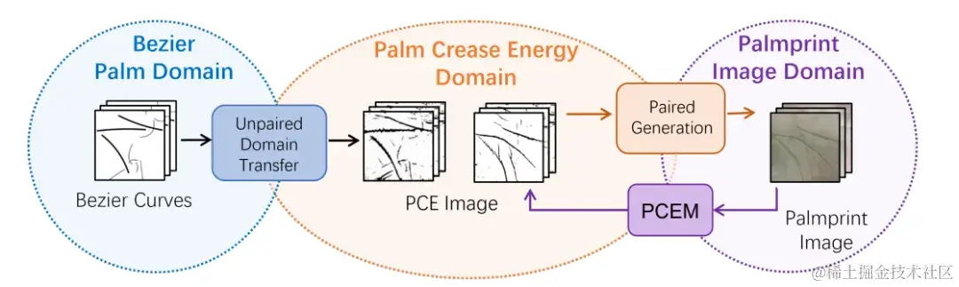 大规模数据的缺乏严重阻碍了掌纹识别的发展。近期方法提出基于贝塞尔曲线生成大规模拟真掌纹来解决这个问题。然而,贝塞尔曲线和真实掌纹之间的显着差异限制了它们的有效性。在本文中,我们将贝塞尔曲线到真实掌纹的差异分为折痕差异和纹理差异,通过分拆降低生成难度。具体来说,我们引入了一种新的手掌折痕能量(PCE)域作为从贝塞尔曲线到真实掌纹的桥梁,并提出了一个两阶段生成模型。第一阶段从贝塞尔曲线生成 PCE 图像(拟真折痕),第二阶段以 PCE 图像作为输入输出真实的掌纹(拟真纹理)。此外,我们还设计了一个轻量级的即插即用线路特征增强块,以方便域转移并提高识别性能。大量的实验结果表明,我们提出的方法超越了最先进的方法。在极少的数据设置下(如 40 个 ID,仅占总训练集的 2.5%),在TAR@FAR=1e-6条件下,我们的方法相对RPG-Palm 提升 29%,相对100%训练集的 ArcFace 提升6%。