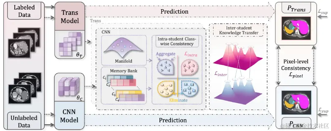 半监督学习(Semi-supervised Learning,SSL)作为主导方法之一,旨在利用未标记的数据来解决监督学习中的标注困境,这在医学图像分割领域引起了广泛关注。大多数现有的方法通过卷积神经网络(CNN)使用单一网络,并通过对输入或模型应用小的扰动来强制保持预测的一致性。然而,这种学习范式的缺点在于:(1)基于CNN的模型对全局学习施加了严重的限制;(2)丰富和多样的类级分布被抑制。在本文中,我们提出了一种新的CNN-Transformer学习框架,用于半监督医学图像分割的流形空间。首先,在学生内部级别,我们提出了一种新颖的类别一致性损失,以促进目标特征表示的判别性和紧凑性学习。然后,在学生之间的级别上,我们使用基于原型的最优传输方法对齐CNN和Transformer特征。大量实验表明,我们的方法在三个公共医学图像分割基准测试中优于先前的最先进方法。