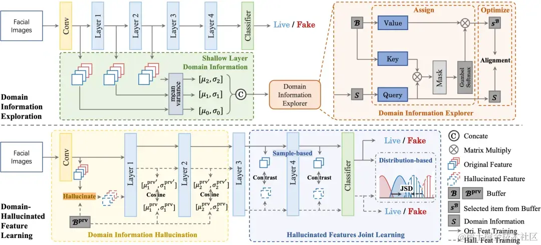 多域人脸活体检测 (MD-FAS) 旨在仅使用新域数据更新新域的模型,同时确保不会忘记从旧域获得的知识。现有方法利用模型的特征来表示旧域知识或将不同的域映射到单独的特征空间中以防止遗忘。然而,由于域差距的存在,新数据的特征不如之前数据的准确。此外,如果没有先前数据提供监督,分离的特征空间可能会在新域上更新时被破坏,从而导致灾难性遗忘。受到缺乏旧域数据所带来的挑战的启发,我们从一个新的角度解决了这个问题,即幻化出旧域数据来更新 FAS 模型。为此,我们提出了一种新颖的域幻化更新(DHU)框架来促进数据的幻化。具体地,域信息浏览器学习旧域的代表性域信息。然后,域信息幻化模块将新域数据幻化成伪旧域数据。此外,提出了幻化特征联合学习模块,通过双级别不对称地对齐真实样本的新域数据和伪旧域数据,以学习更通用的特征,从而促进所有域的结果。我们的实验结果和可视化结果表明,所提出的方法在有效性方面优于最先进的竞争对手。