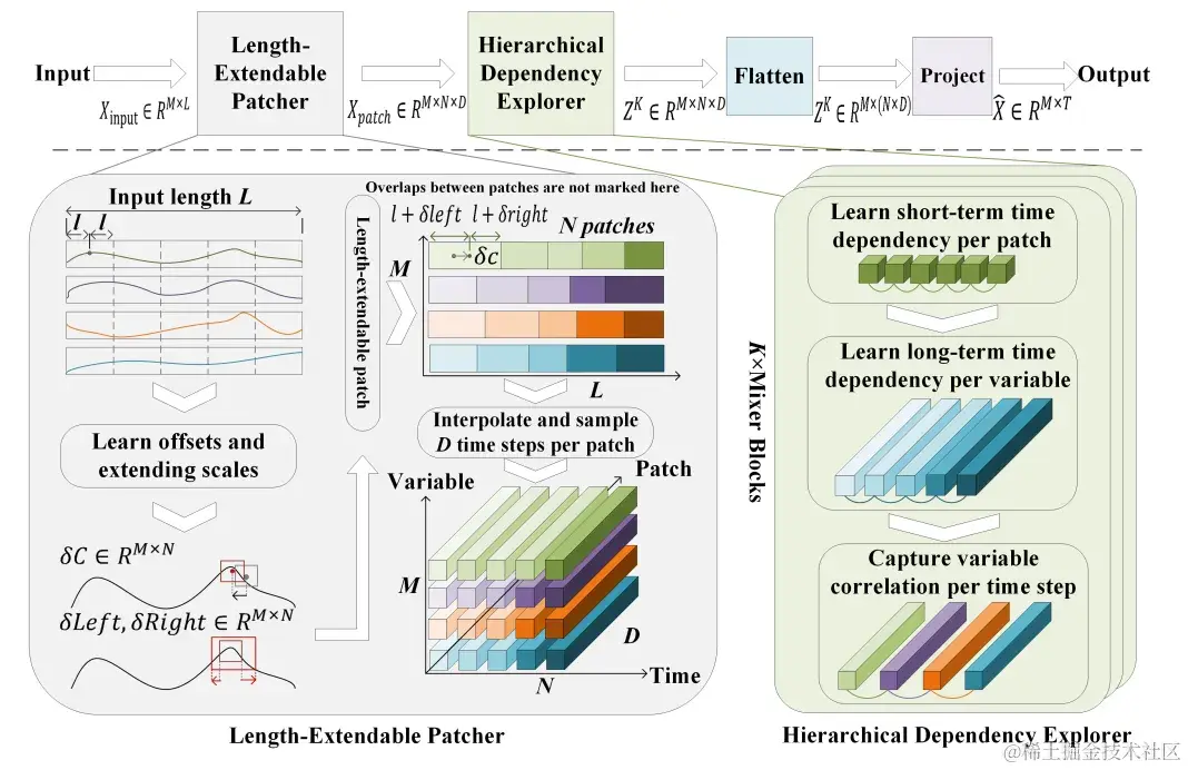 多元时间序列(MTS)预测已广泛应用于各种场景。最近,一些方法采用patch来增强局部语义并提高模型性能。然而,长度固定的patch很容易丢失时间边界信息,例如完整的峰值和周期。此外,现有方法主要侧重于对patch之间的长期依赖性进行建模,而很少关注其他维度(例如patch内的短期依赖性以及跨变量patch之间的复杂交互)。为了解决这些挑战,我们提出了一种纯基于 MLP 的 HDMixer,旨在通过有效地建模分层交互来获取具有更丰富语义信息的patch。具体来说,我们设计了一个针对 MTS 的长度可扩展patch(LEP),它丰富了patch的边界信息并减轻了系列中的语义不连贯。随后,我们设计了一个基于纯 MLP 的分层依赖关系展示器(HDE)。该展示器可以有效地模拟patch内的短期依赖关系、patch之间的长期依赖关系以及patch之间的复杂交互。对 9 个真实世界数据集的广泛实验证明了我们方法的优越性。