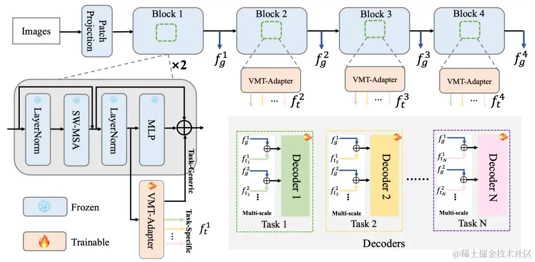 近期,大规模预训练模型在多种视觉下游任务中取得了显著提升,然而对预训练模型进行全量参数微调提升了模型的计算和存储成本。在自然语言处理领域的启发下,参数高效微调方法(PETL)在视觉任务中得到成功的应用,但现有技术主要聚焦于单任务的适配,如何更好地将参数高效微调方法应用于视觉多任务学习中仍是一个挑战。本文提出了一种“once-for-all”的视觉多任务适配方法(VMT-Adapter),具有极高的训练和推理效率,在任务数上具有O(1)的时间复杂度,这使得VMT-Adapter可以利用极少的参数处理几乎任意数量的任务。VMT-Adapter不仅通过参数共享实现了跨任务信息交互,同时还为每个任务单独设置了知识提取模块来保留任务的特定知识。本文在包含4个密集场景理解任务的数据集上验证了方法的有效性:VMT-Adapter仅利用预训练模型1%的参数量,便可以取得3.96%的显著提升。