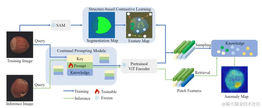 在工业制造中,具有增量训练的无监督异常检测(UAD)至关重要,因为无法获得足够的标记数据来应对不可预测的缺陷。然而,当前的持续学习(CL)方法主要依赖于监督注释,而在UAD中的应用受限于缺乏监督。目前的UAD方法会按顺序为不同的类别训练单独的模型,导致灾难性遗忘和沉重的计算负担。为了解决这个问题,我们引入了一种名为UCAD的新型无监督持续异常检测框架,通过对比学习的提示赋予UAD持续学习能力。在提出的UCAD中,我们设计了一个持续提示模块(CPM),利用简洁的键-提示-知识存储库来引导任务无关的“异常”模型预测,使用任务特定的“正常”知识。此外,我们设计了基于结构的对比学习(SCL),并结合分割任意模型(SAM)来改进提示学习和异常分割结果。具体而言,通过将SAM的掩码视为结构,我们将同一掩码内的特征拉近,并将其他特征推开,以获得通用的特征表示。我们进行了全面的实验,并在无监督持续异常检测和分割方面设定了基准,证明我们的方法在异常检测方面明显优于其他方法,即使使用了回放训练。
