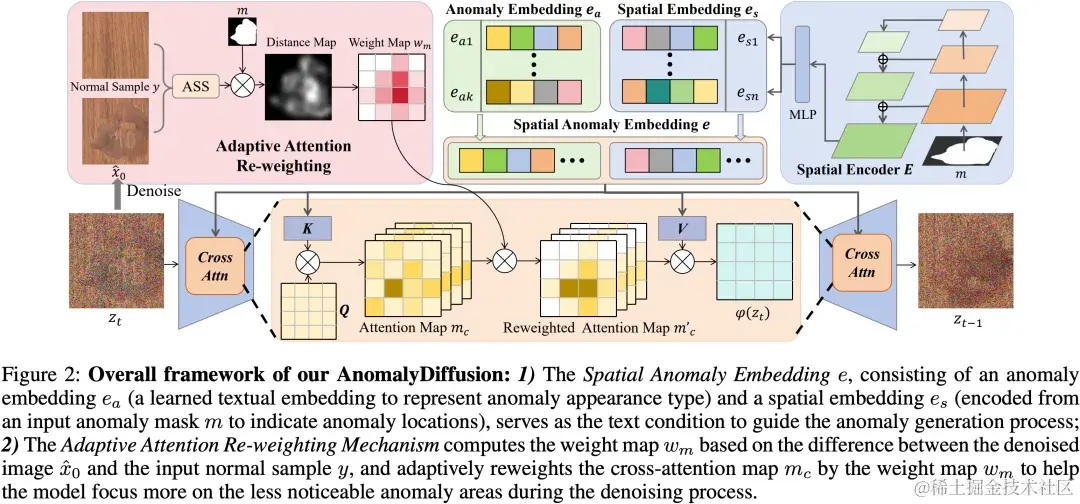 异常检查在工业制造中起着重要的作用。现有的异常检查方法由于异常数据不足而在性能上受到限制。尽管已经提出了异常生成方法来增加异常数据,但它们要么生成真实性差,要么生成的异常和掩模之间的对齐不准确。为了解决上述问题,我们提出了AnomalyDiffusion,这是一种新颖的基于扩散的少样本异常生成模型,它利用从大规模数据集中学习到的潜在扩散模型的强先验信息,以增强在少样本训练数据下的生成真实性。首先,我们提出了空间异常嵌入,它由一个可学习的异常嵌入和一个从异常掩模编码的空间嵌入组成,将异常信息解耦为异常外观和位置信息。此外,为了提高生成的异常和异常掩模之间的对齐,我们引入了一种新颖的自适应注意力重新加权机制。基于生成的异常图像和正常样本之间的差异,它动态地引导模型更多地关注生成的异常不太明显的区域,从而使得能够生成准确匹配的异常图像-掩模对。大量的实验表明,我们的模型在生成真实性和多样性方面显著优于最先进的方法,并有效地提高了下游异常检查任务的性能。