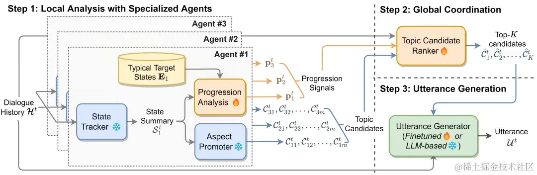 近年来,人们对探索具有更复杂目标的对话越来越感兴趣,例如谈判、说服和情绪支持,这些都超越了传统的服务型对话系统。除了需要更复杂的策略性推理和沟通技巧外,这些任务的一个重大挑战在于,它们的目标实现难以以可量化的方式客观衡量,这使得现有的研究难以直接优化对话过程以实现这些目标。在我们的工作中,我们强调复杂对话目标的多面性,并认为通过全面考虑并共同推动其不同方面,更有可能实现这些目标。为此,我们提出了一个新的对话框架,COOPER,它协调多个专门的代理,每个代理分别致力于特定的对话目标方面,以接近复杂的目标。通过这种分而治之的方式,我们使复杂的对话目标更易于接近,并通过各个代理的协作引发更大的智能。在说服和情绪支持对话的实验中,我们的方法对比基线能达到更好的性能。
