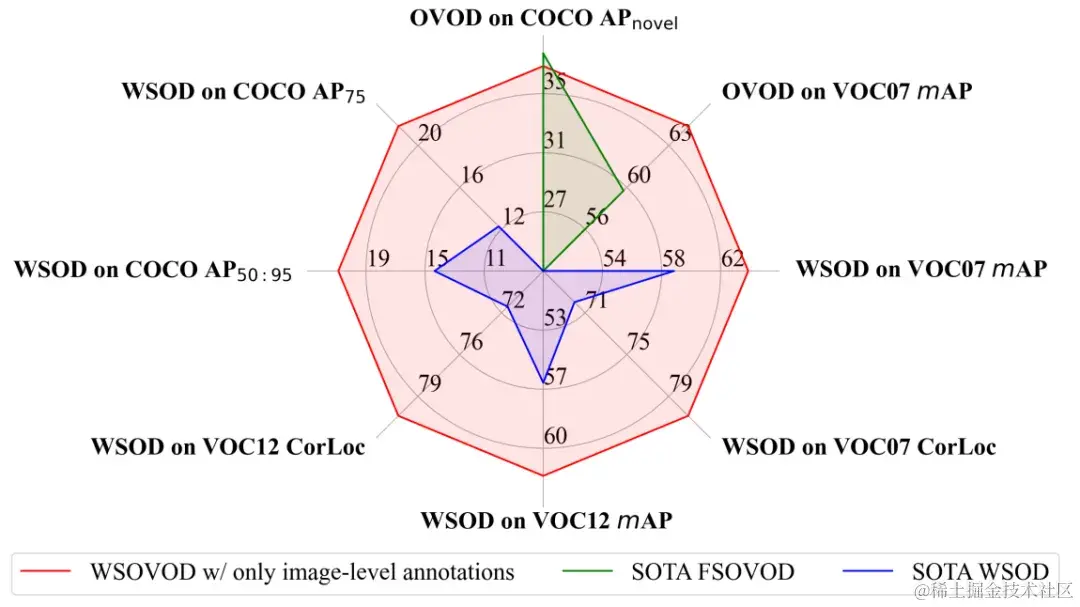 尽管弱监督目标检测(WSOD)是避免使用实例级别标注的有前途的方法,但其能力仅限于单个训练数据集中的封闭集类别。在本文中,我们提出了一种新颖的弱监督开放词汇目标检测框架,即WSOVOD,将传统的WSOD扩展为检测新概念,并利用只有图像级别注释的不同数据集。为了实现这一目标,我们探索了三种关键策略,包括数据集级别的特征适应,图像级别的显著目标定位,以及区域级别的视觉语言对齐。首先,我们进行数据感知特征提取,以产生输入条件的系数,该系数被利用到数据集属性原型中以识别数据集偏差并帮助实现跨数据集泛化。其次,我们提出了一个定制的位置导向的弱监督候选区域网络,以利用来自类别无关的分割任何模型的语义布局来区分目标边界。最后,我们引入了一种候选区域概念同步的多实例网络,即目标挖掘和与视觉语义对齐的细化,以发现与概念文本嵌入匹配的目标。在Pascal VOC和MS COCO上的大量实验表明,所提出的WSOVOD在封闭集目标定位和检测任务中都比之前的WSOD方法更好,并取得了新的最先进水平结果。同时,WSOVOD实现了弱监督下的跨数据集和开放词汇学习,并且取得了与全监督开放词汇目标检测(FSOVOD)相当甚至更好的效果。