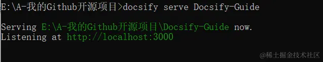 docsify serve 项目名称启动一个本地服务器,可以方便地实时预览效果。默认访问地址 http://localhost:3000 。
