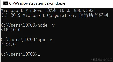 win+r:cmd 进入命令提示符窗口,分别输入以下命令查看 node 和 npm 的版本能够正常显示版本号,则安装成功: