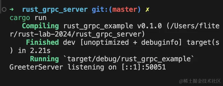 cargo run来编译和运行项目,服务器将启动并监听在[::1]:50051