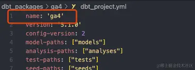 而项目的名称,我们可以在 dbt_project.yml 文件的 name 字段获取你的项目名称。