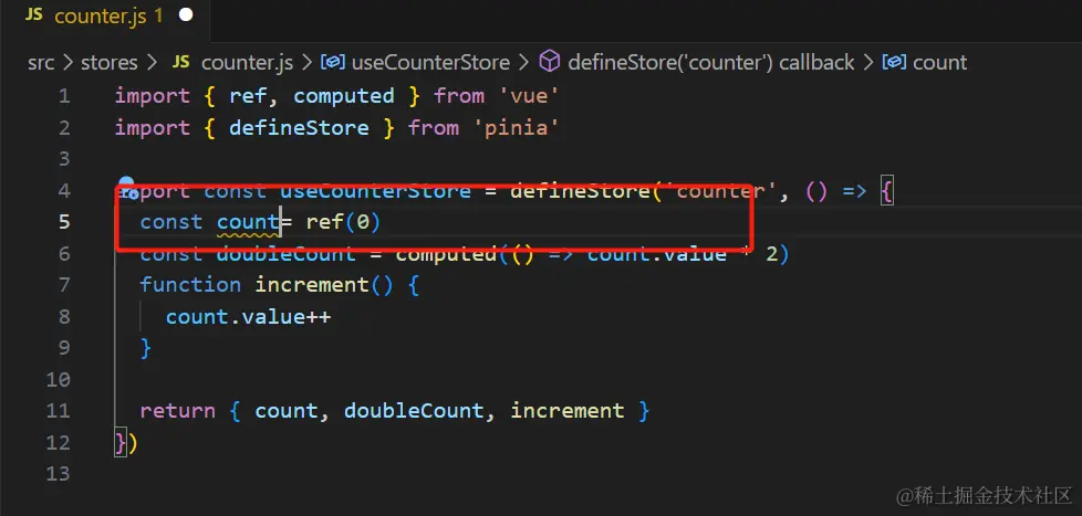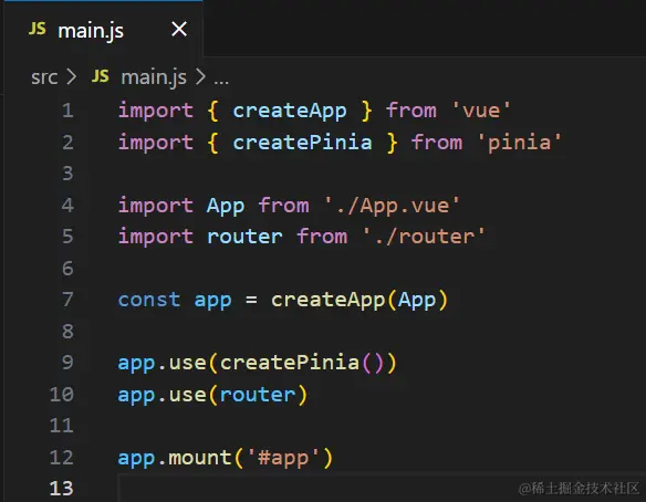 对于 main.js 文件中的内容(下图),可以看到 pinia 的创建和注册其实都是耦合在这个文件里的,我们可以将 pinia 的创建抽取出来,这个 main.js 文件只负责其他模块的注册。