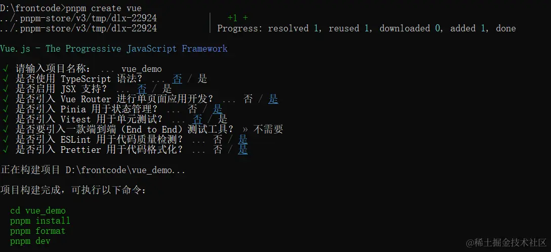 配置好环境后就可以打开终端在命令行里输入 pnpm create vue 创建一个 vue3 项目了。接下来只需要输入自己的项目名称,以及配置一些选项,目前来说大部分项目只需要用到图下这些就可以了。当然你也可以按照自己的需求去选择。